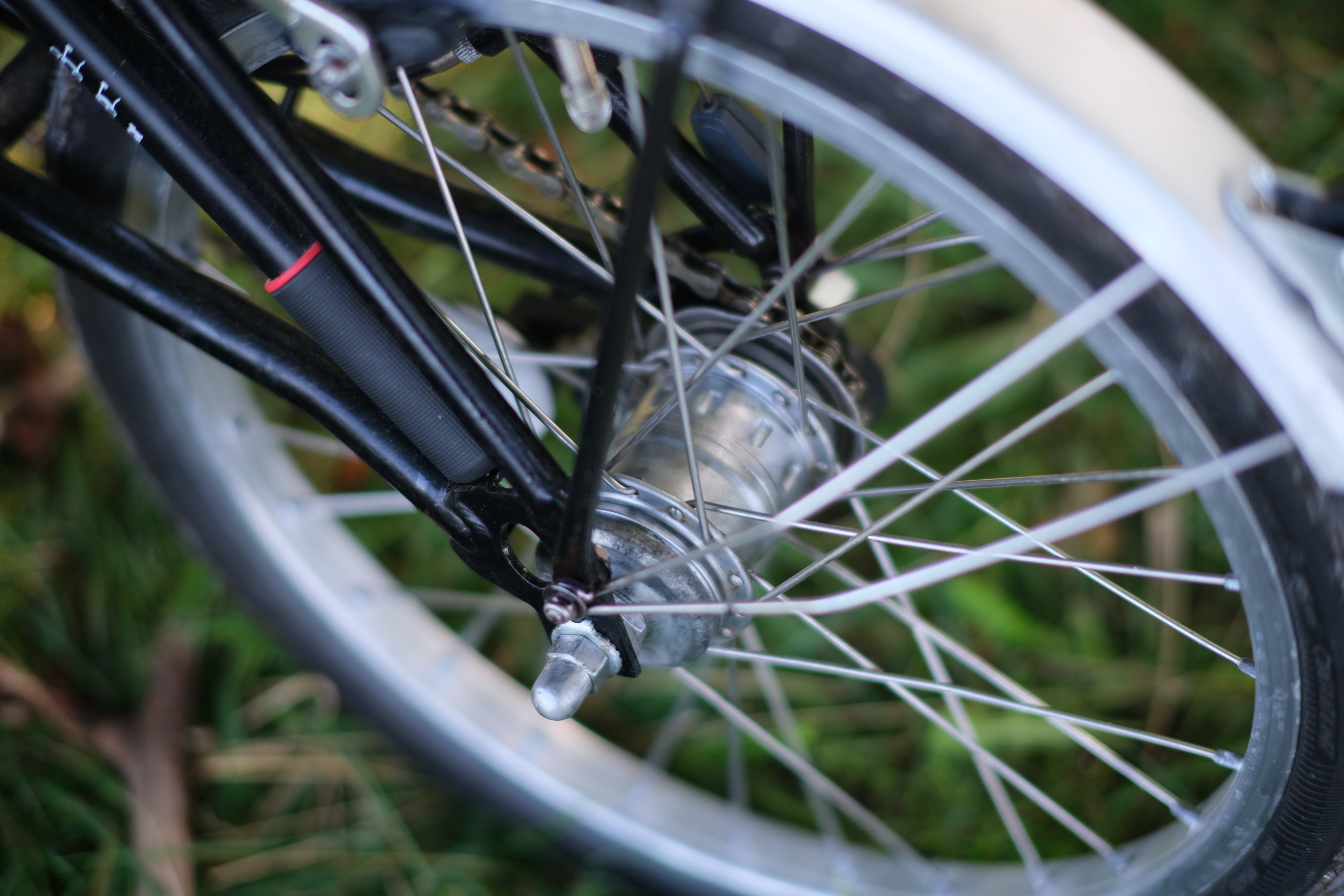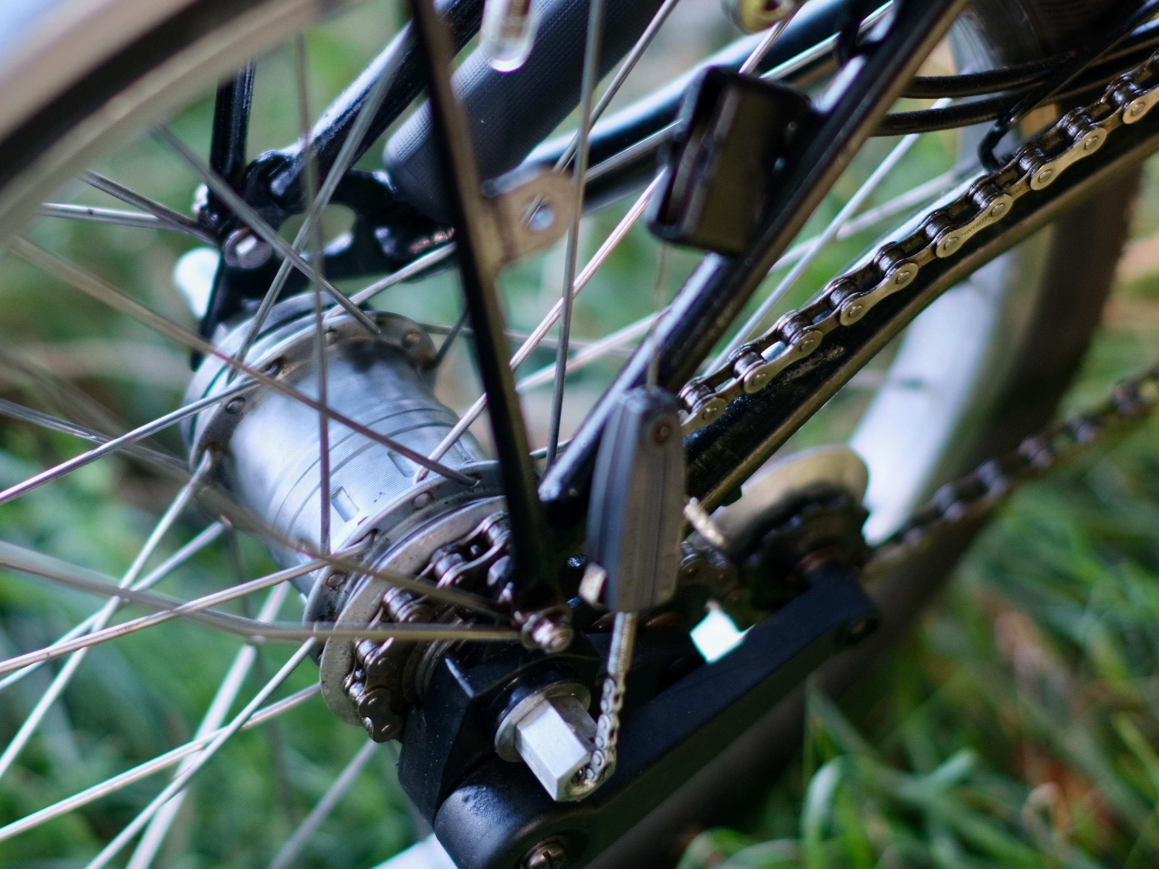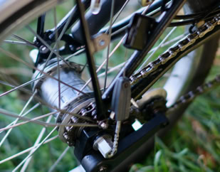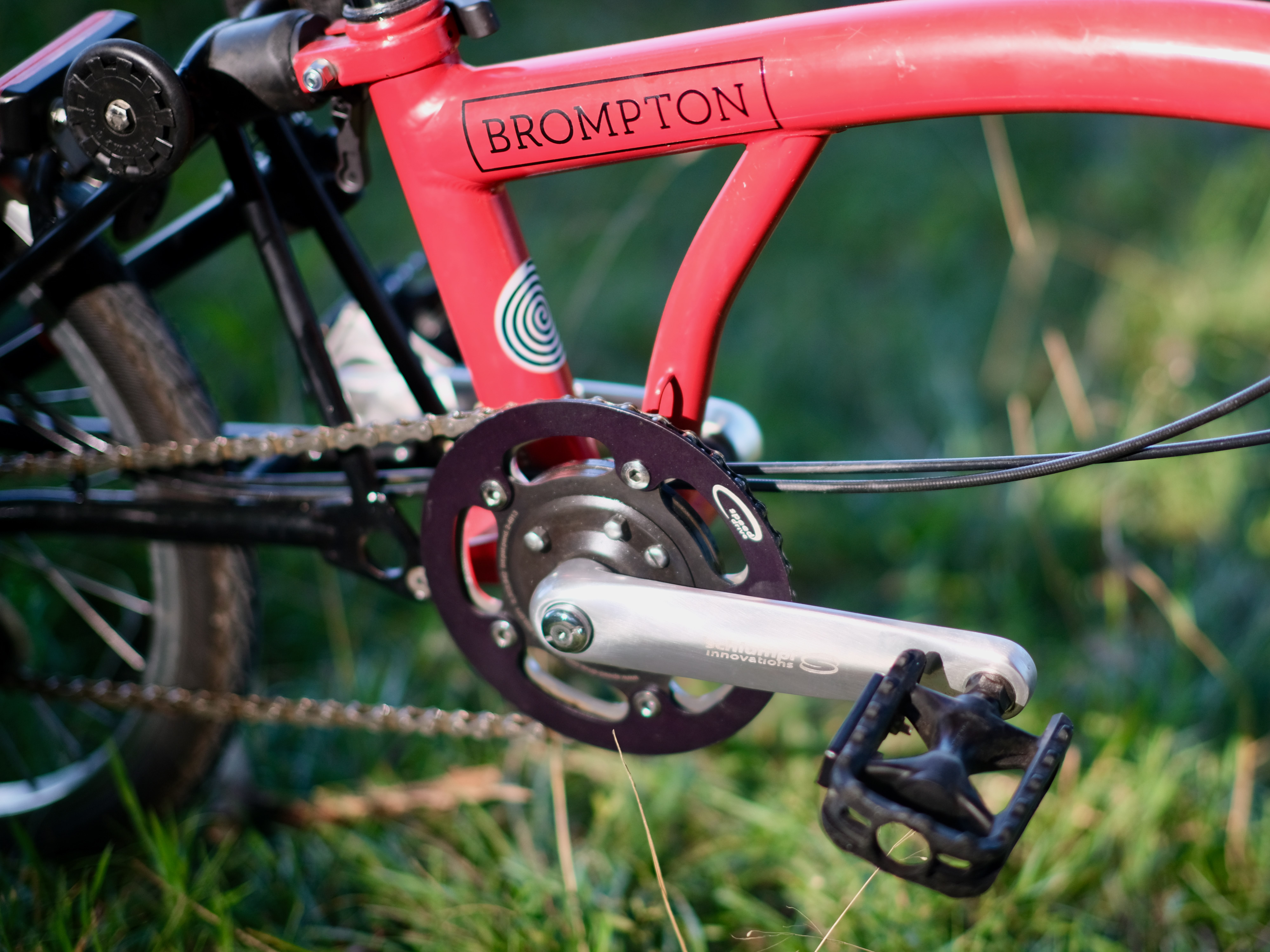 An die Übersetzungsbandbreite von einer hinteren treuen Sachs Torpedo 3-Gang Nabe und dem vorderen Schlumpf Speed Drive, kommt kein heutiges und damaliges Brompton von der Stange heran.Â