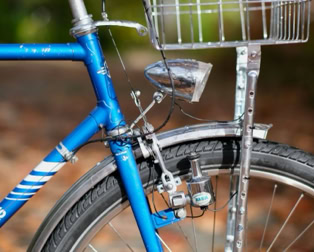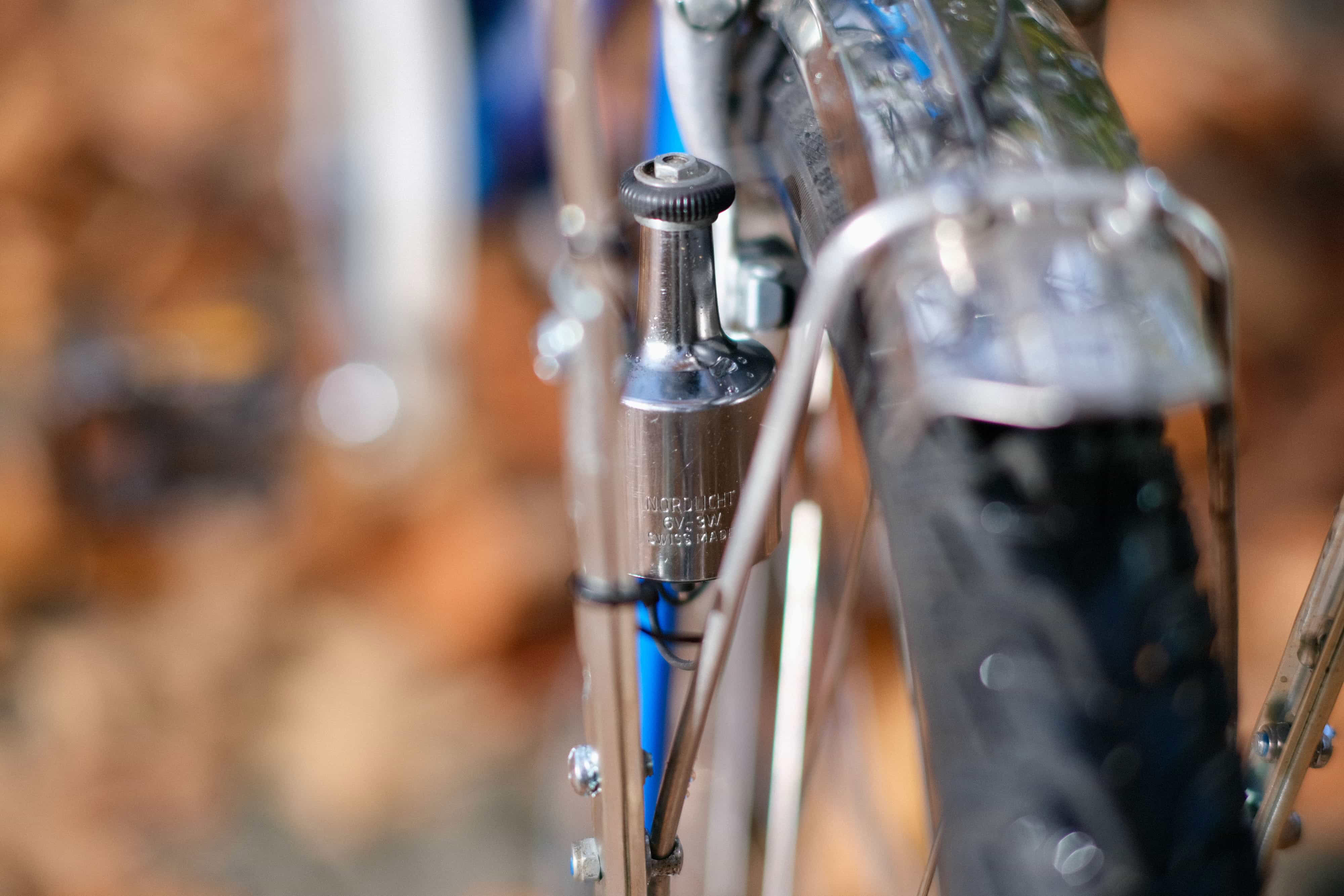 Ein Schätzchen der 80er. Ein aufgemöbeltes Garagenfahrzeug eines fränkischen Opas. Jede Lagerkugel und jedes Zahnrad wurde gereinigt und neu gefettet. Der verchromte Nordlicht Dynamo liefert noch Jahrzehnte lang helles Kerzenlicht. Zusätzlich Batterierücklicht als Backup oben am Gepäckträger. Sicherere zweiadrige Verkabelung passt hier nicht vom Stil bzw. wäre langweilig. Edelstahl Felgen und Schutzbleche rosten nicht. Die Weinmann Vorderradbremse ist eher dazu gedacht die vorderen Felgenflanken sauber zu wischen aber gehört eben dazu. Mit den Shimano XT Klickpedalen bekommt man ordentlich Druck auf die treue Sachs 515 Torpedo 3-Gang Nabe hinten.