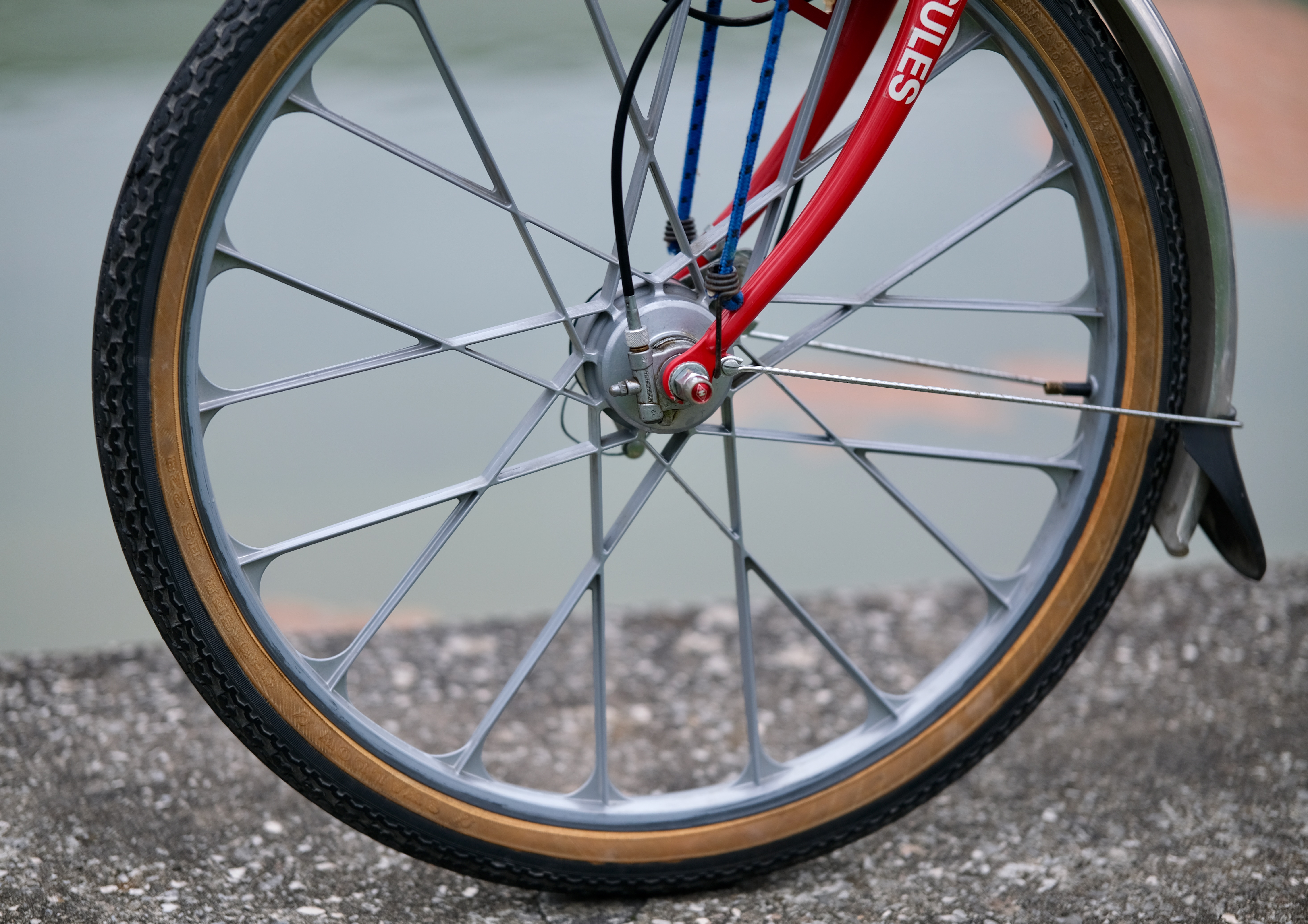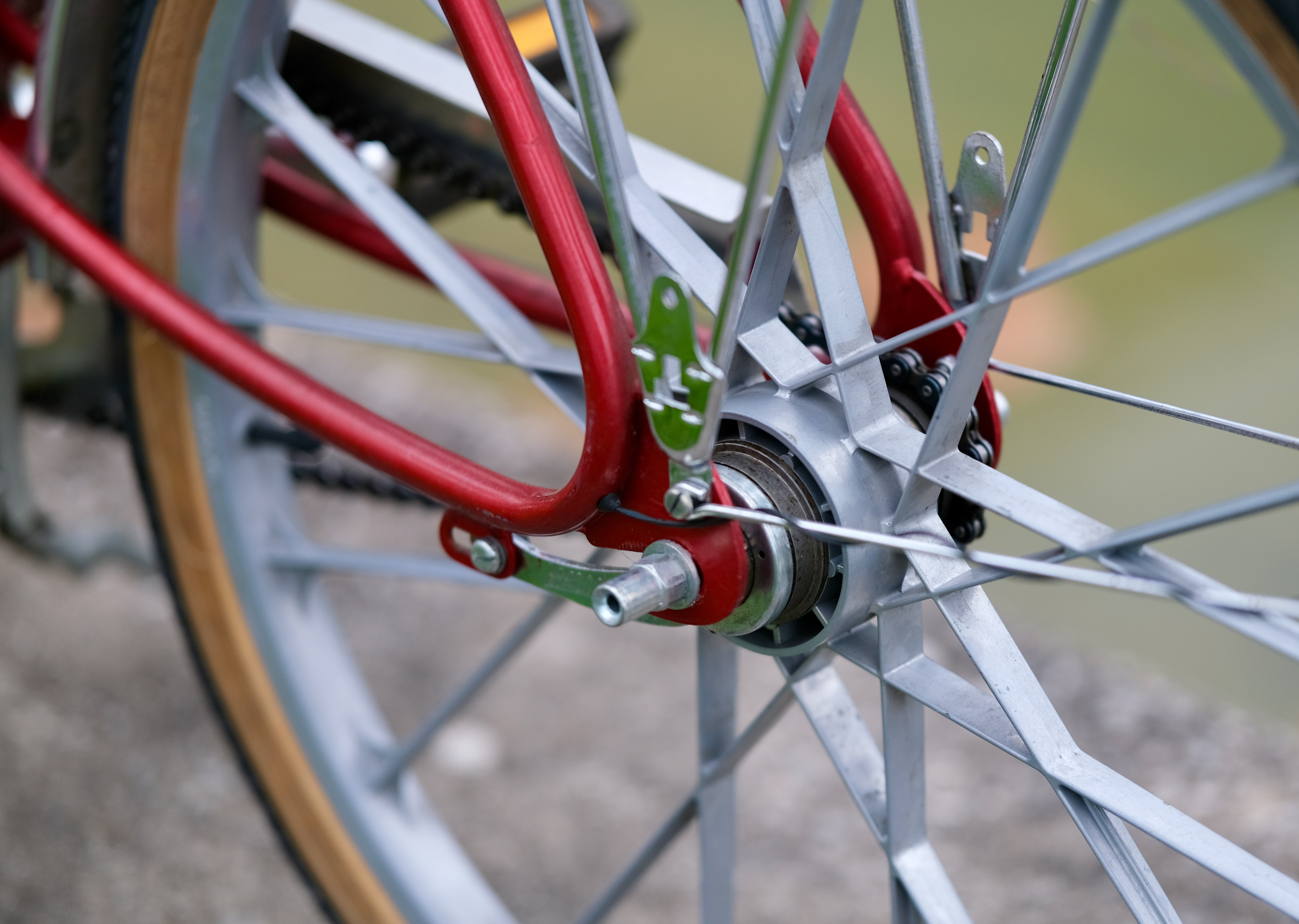 Die Laufräder sind in Alu-Druckguss gefertigt und das hintere wurde irgendwie mit einer Sachs Torpedo 3-Gang Nabe bestückt.Â
