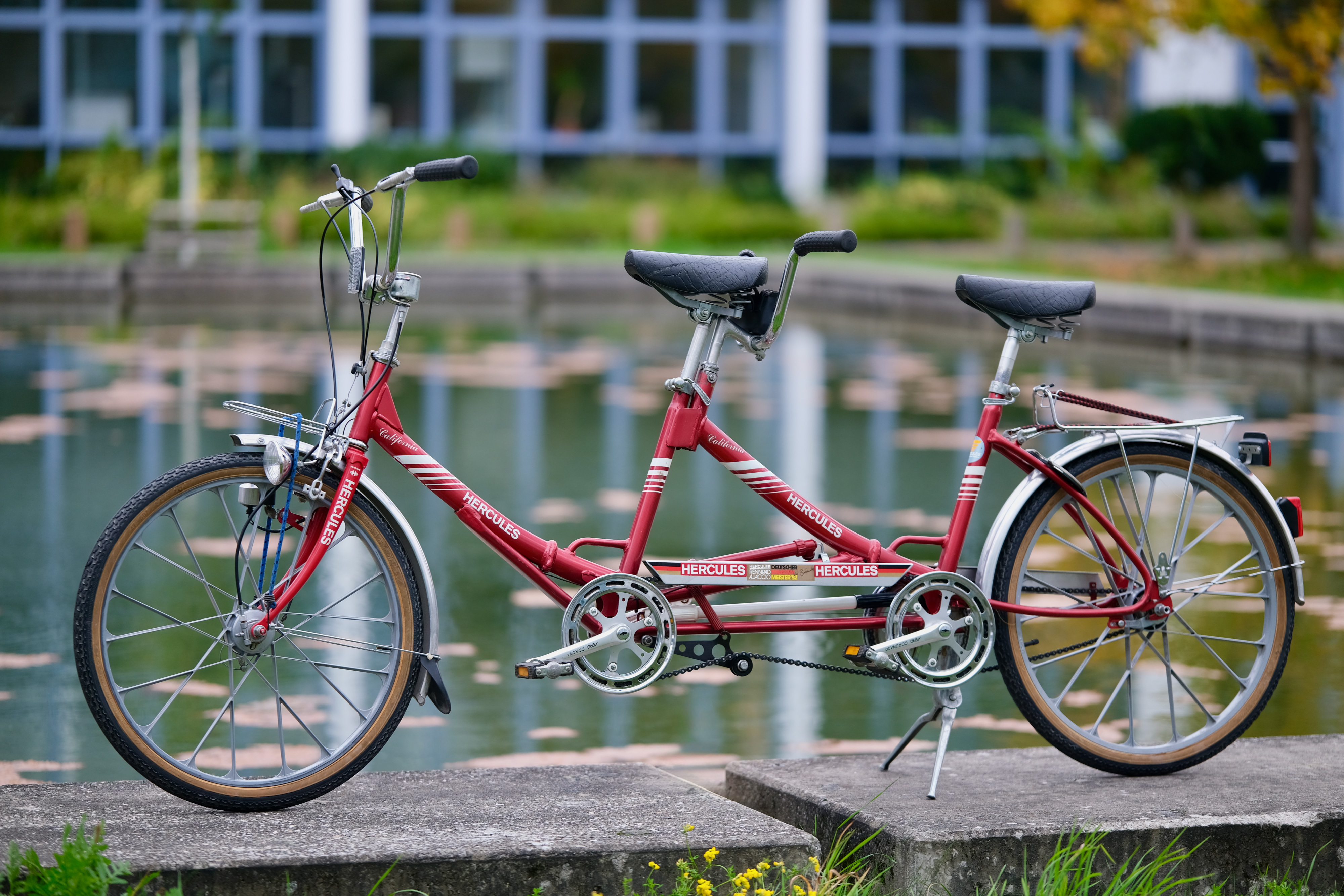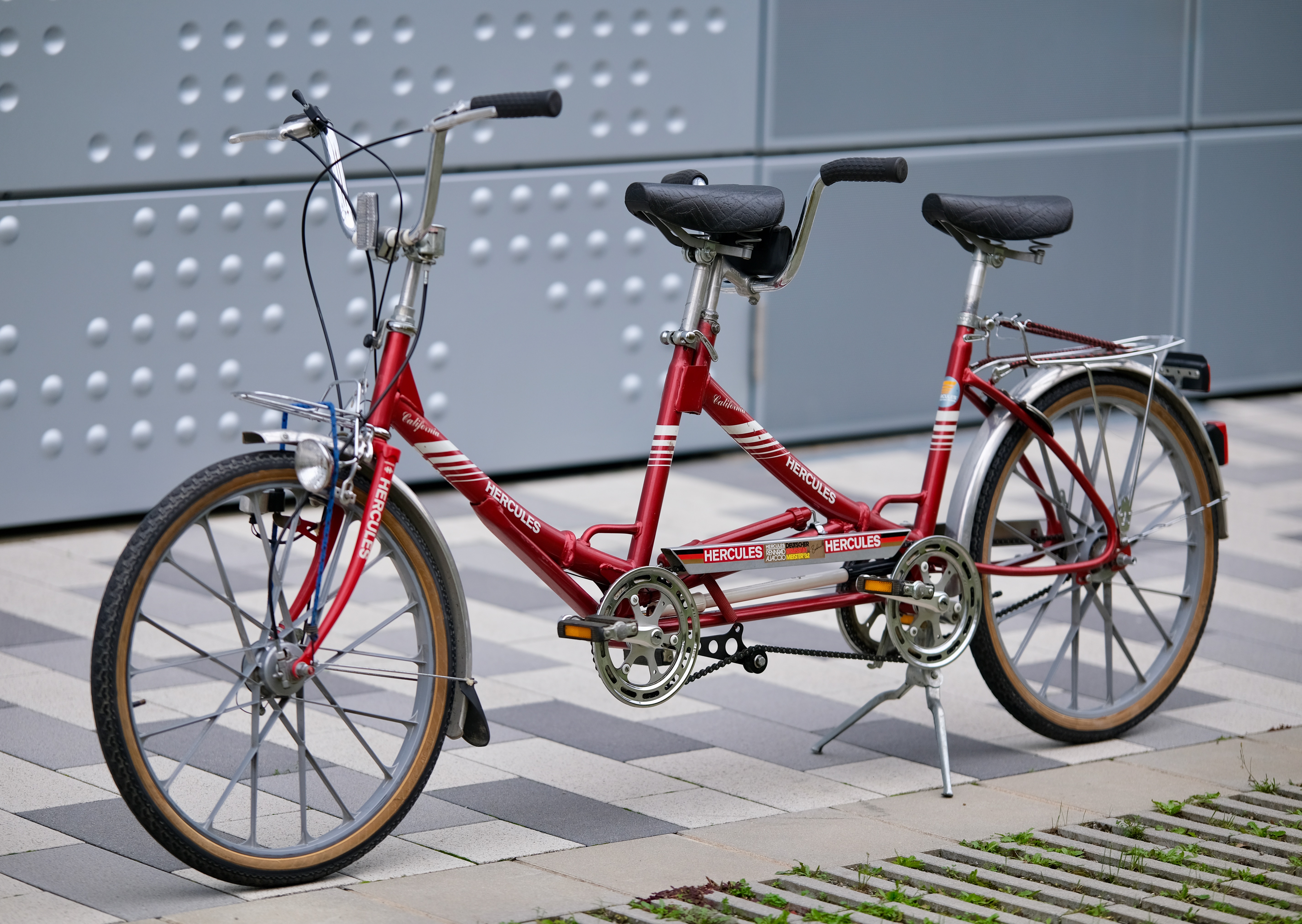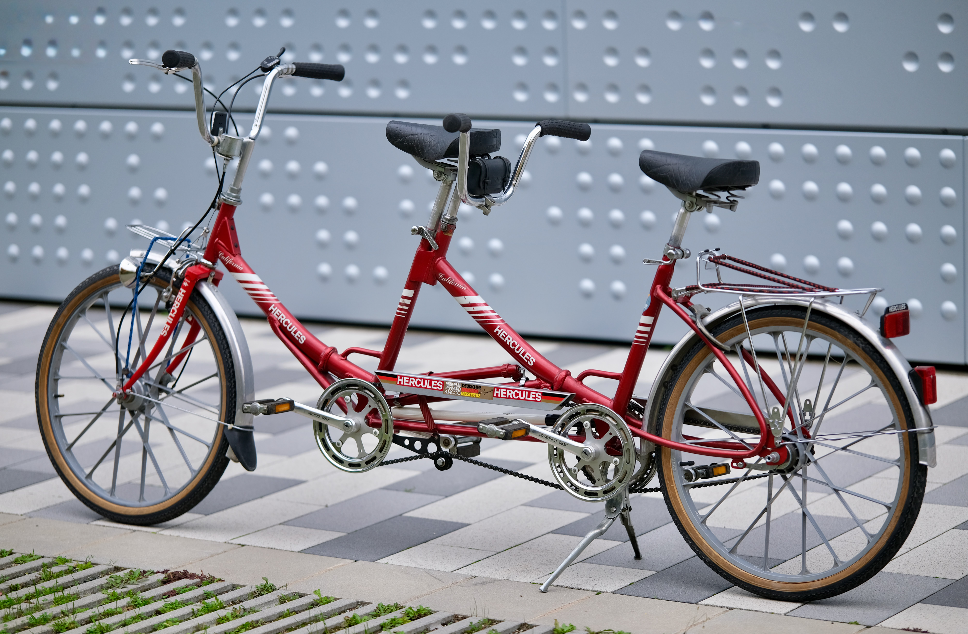 Ich glaube die Hercules Mitarbeiter waren auch irgendwie mächtig stolz auf dieses Fahrrad, sonst hätten Sie nicht so oft den Markennamen darauf platziert. Stand 2025 wurde diese schöne Tandem nur 139,186047km pro Jahr bewegt!